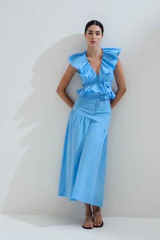 STEFANEL Slim-fit pure linen midi dress striped fabric with a V-neck. White/blue