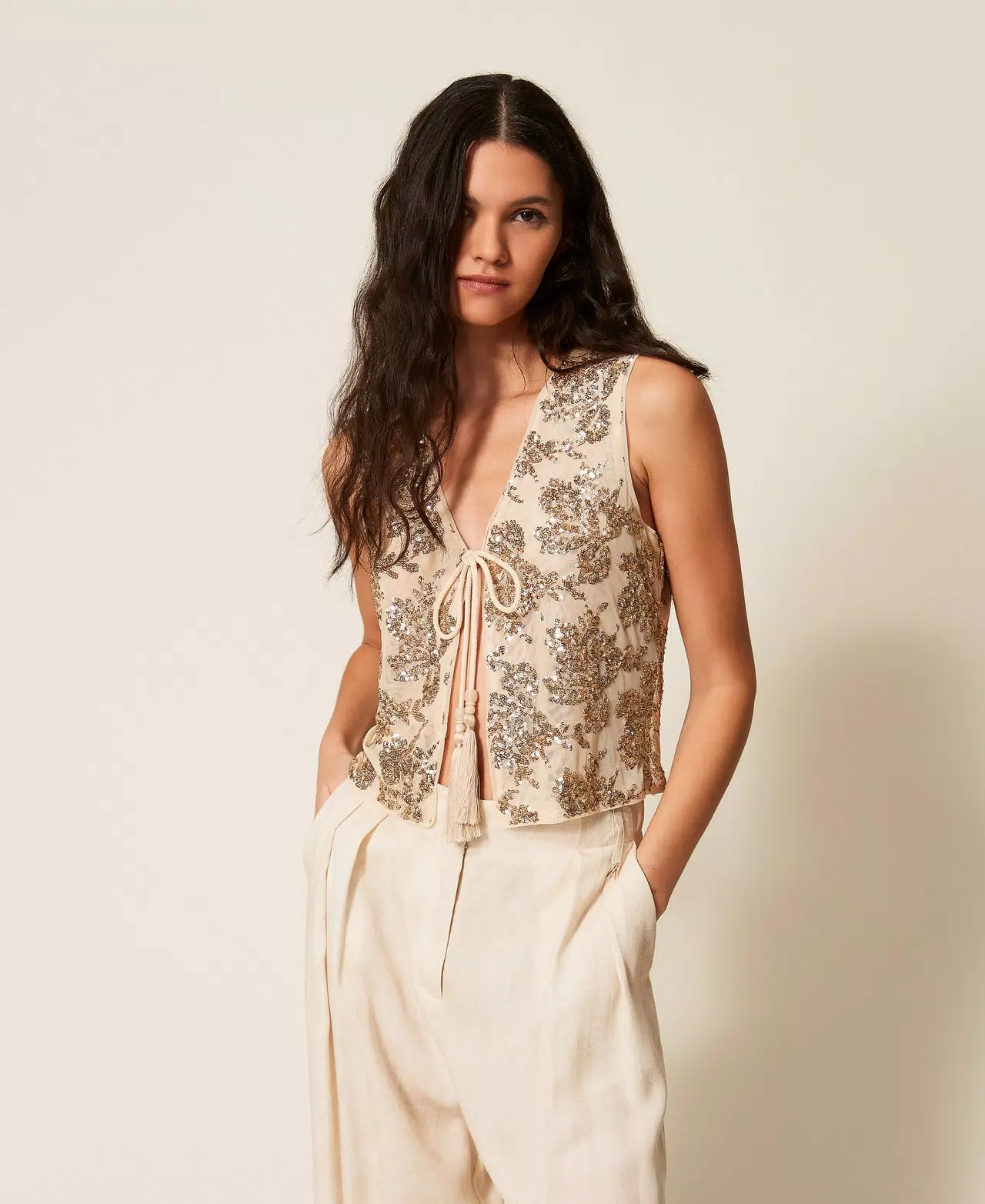 Γιλέκο από τούλι της συλλογής Actitude με κέντημα με πούλιες σε όλη την επιφάνεια. V λαιμόκοψη, δέσιμο με κορδόνι και φούντες στο τελείωμα, τελείωμα, φόδρα, στενή εφαρμογή.