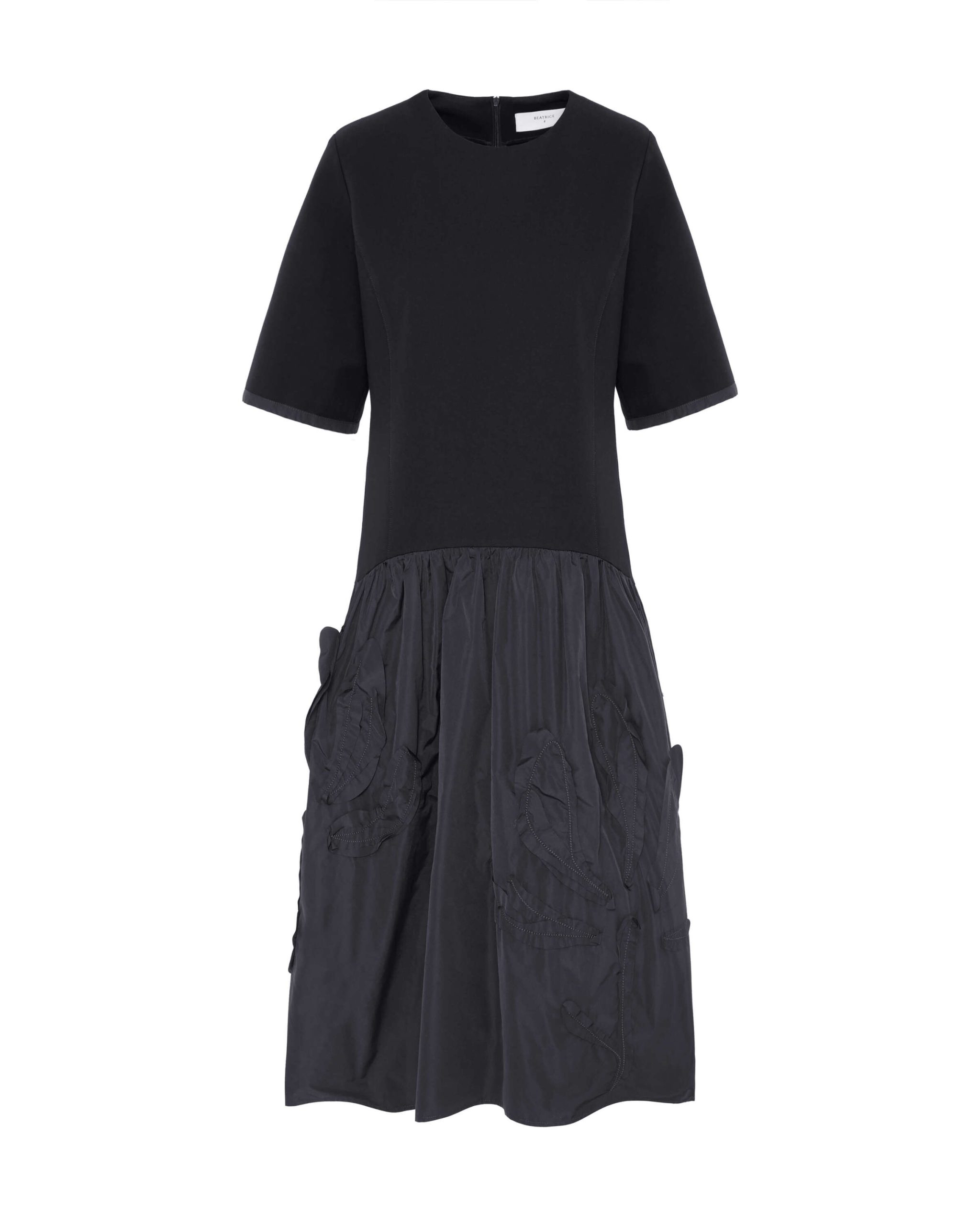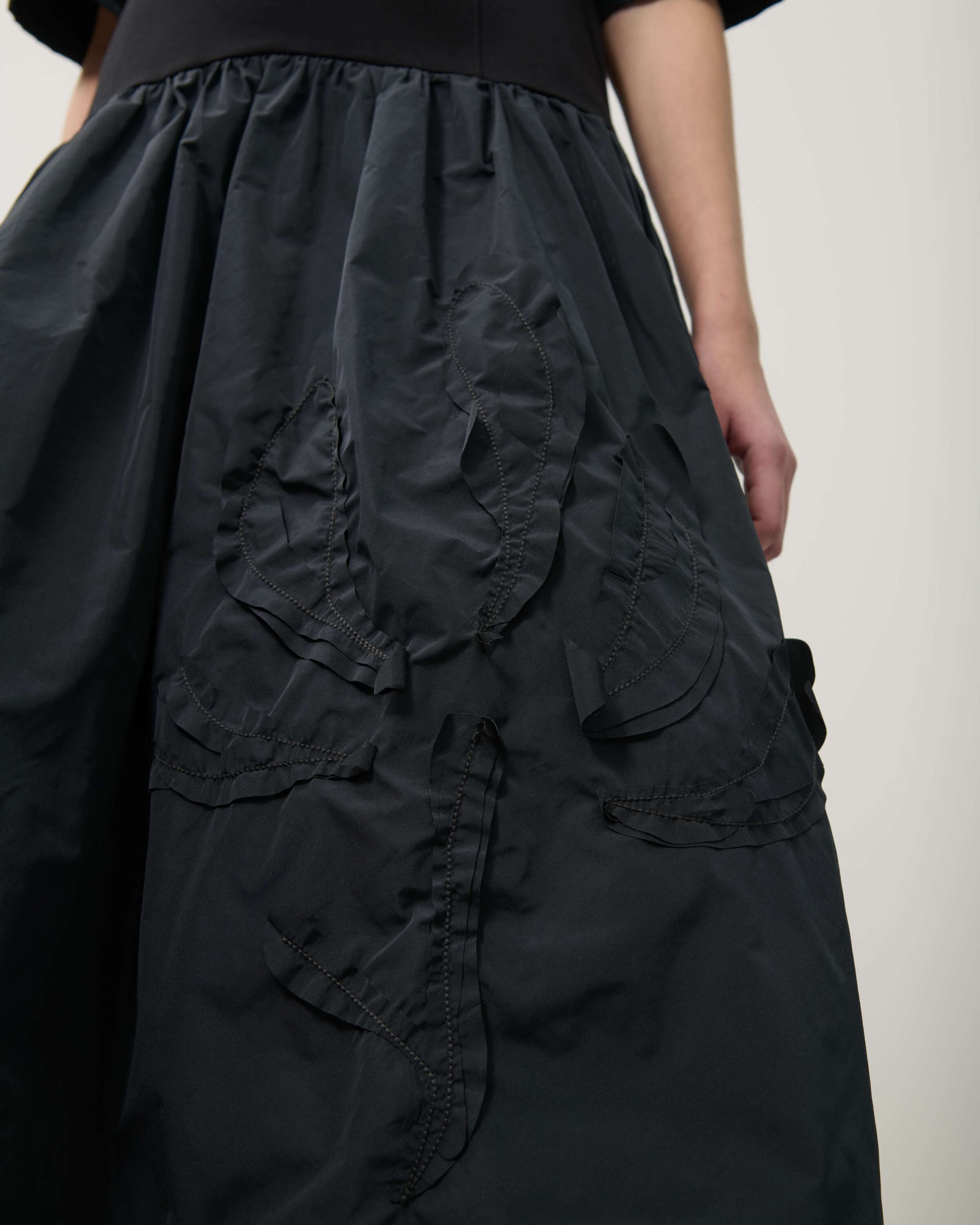 Η πλήρης, ασορτί φούστα από ταφτά είναι διακοσμημένη με ένα μεγάλο φλοράλ κέντημα στο μπροστινό μέρος.