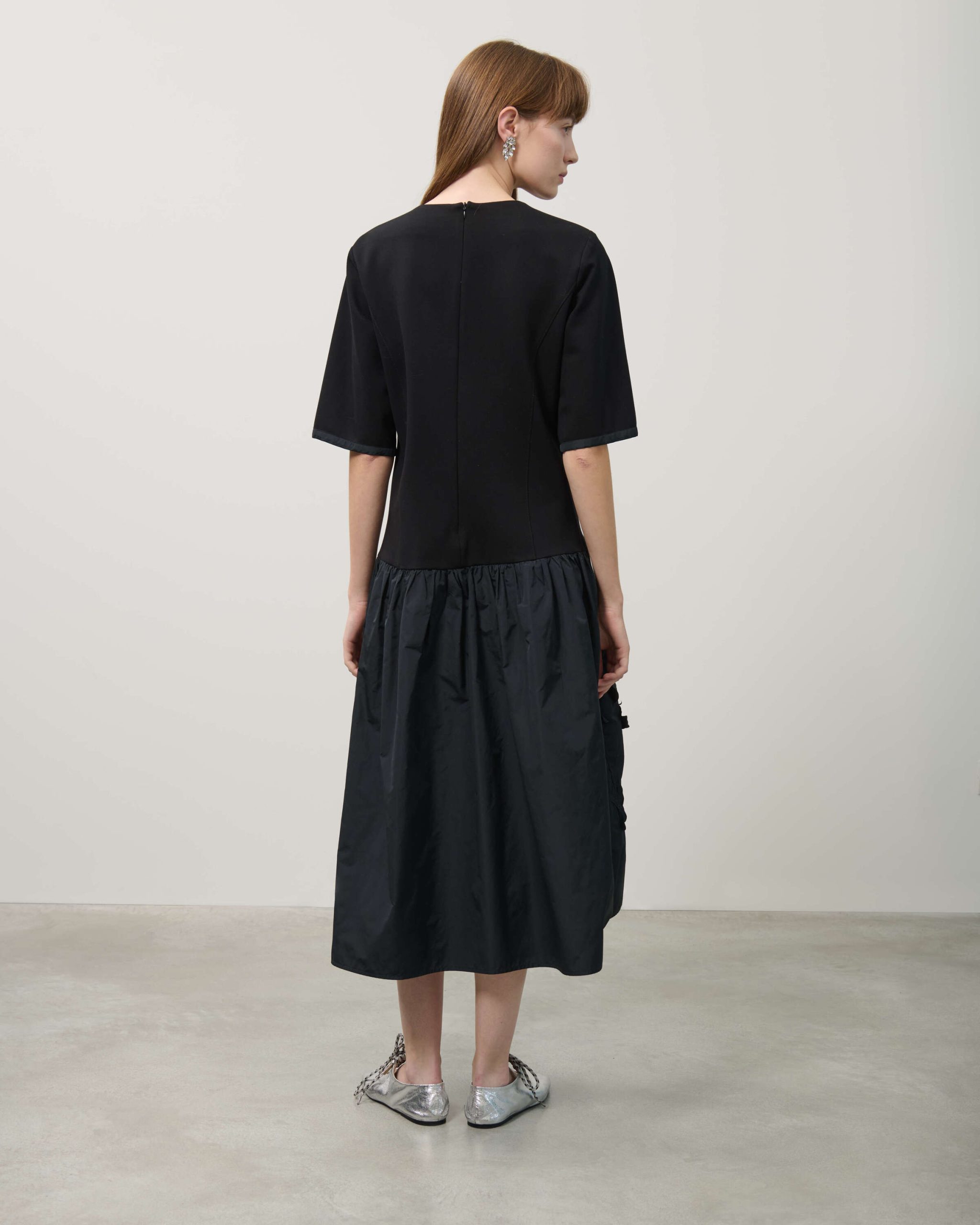 Κατασκευασμένο με μιλανέζικη βελονιά, διαθέτει στρογγυλή λαιμόκοψη και φαρδιά κοντά μανίκια με χαμηλό, ασορτί τελείωμα.