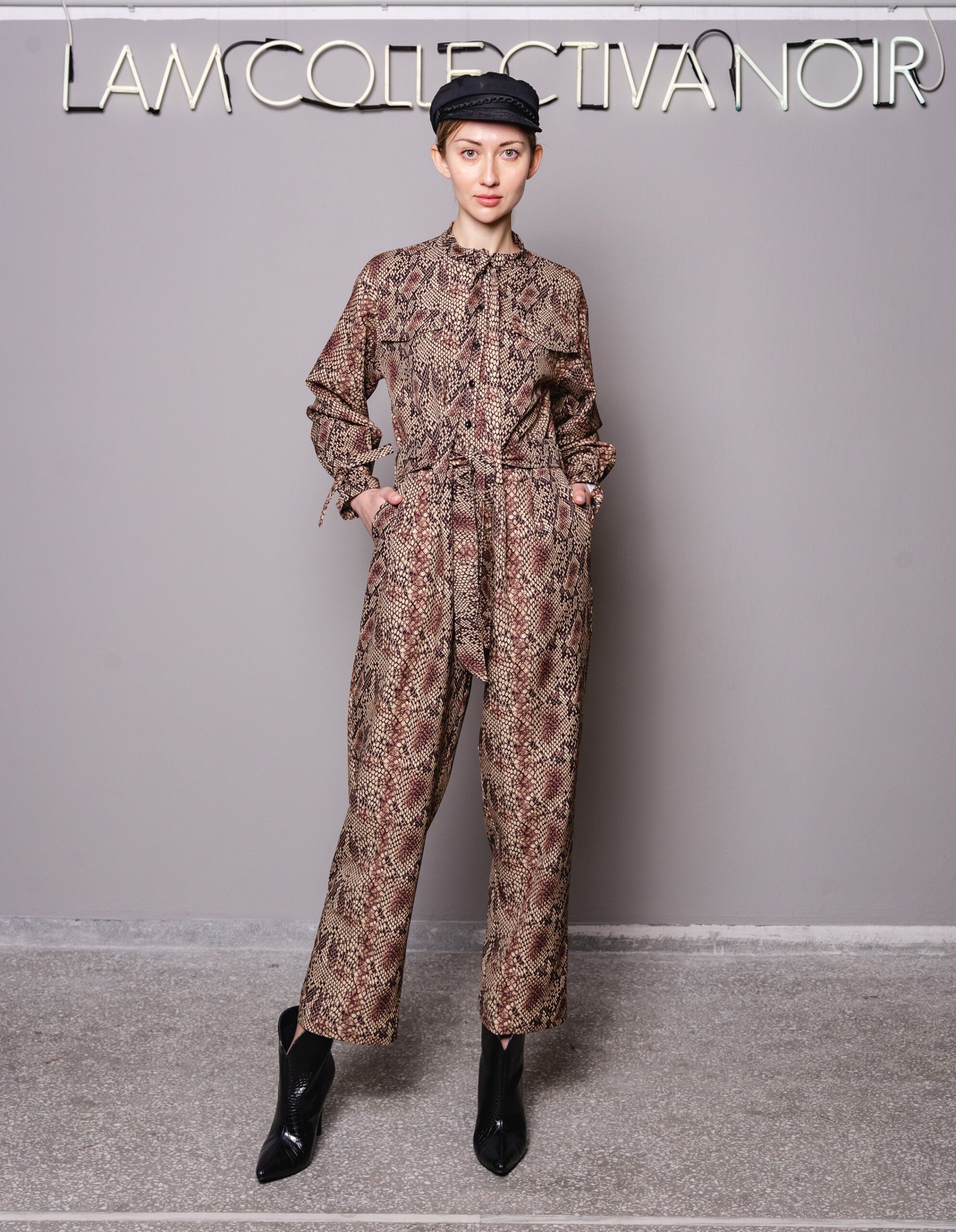 Ολόσωμη φόρμα animal print με μακρύ μανίκι. Μαλακή υφή, ελαστικό ύφασμα. Ζώνη στη μέση από το ίδιο ύφασμα.
