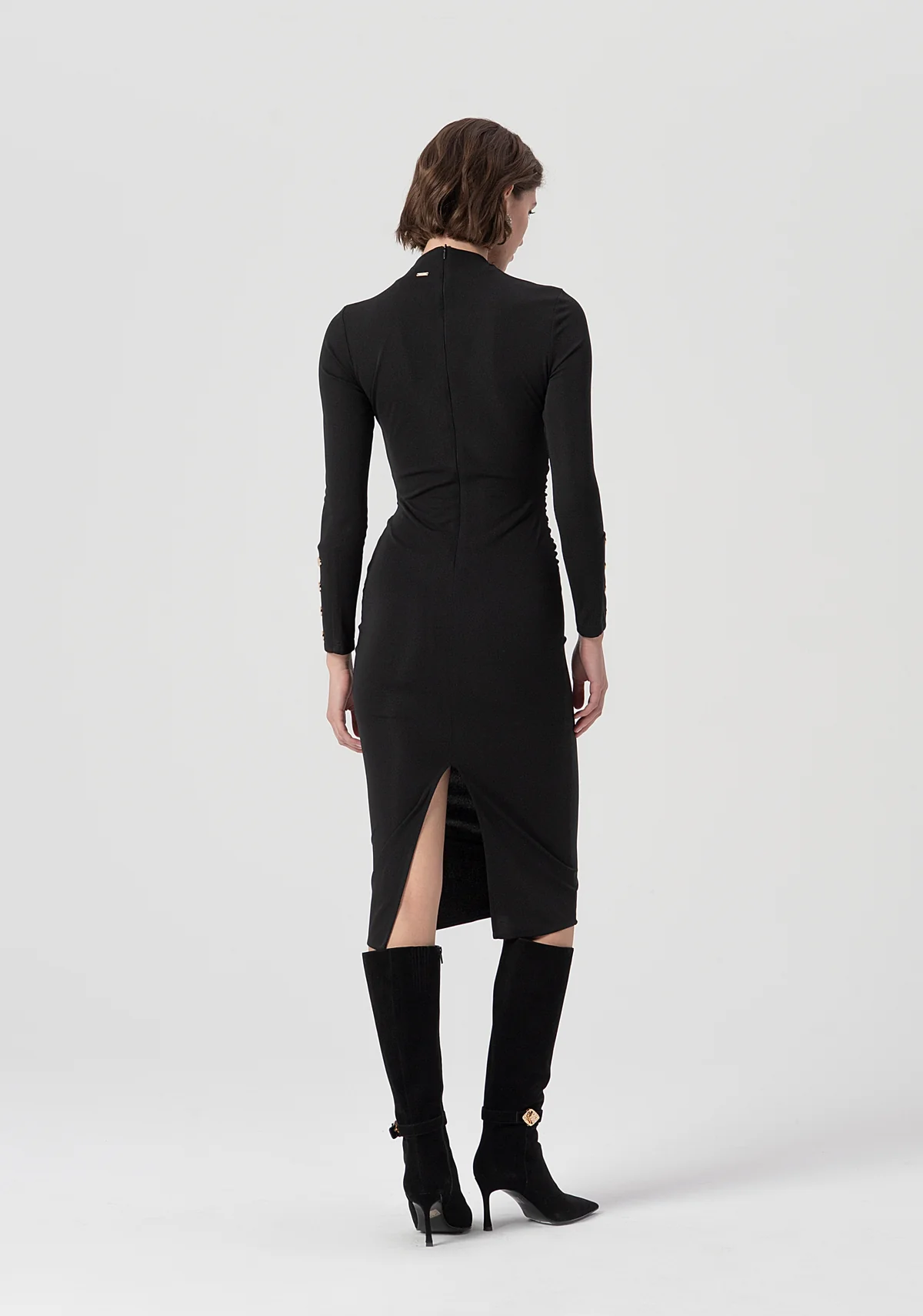 Φόρεμα στενής εφαρμογής, μεσαίου μήκους, από ελαστικό ύφασμα. Ψηλός λαιμός, φερμουάρ στο πίσω μέρος για άνοιγμα, μακριά μανίκια και αεραγωγός στο κάτω μέρος της πλάτης.