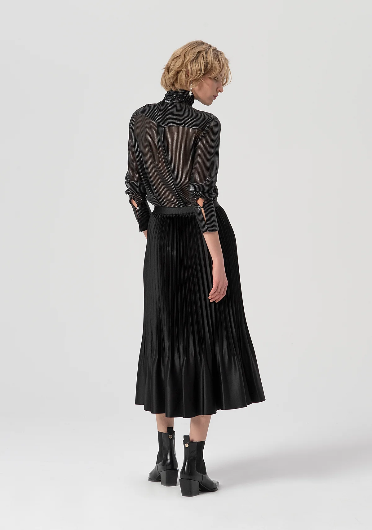Φούστα φαρδιά μεσαίου μήκους από σατέν με πλισέ εφέ και ψηλή μέση .