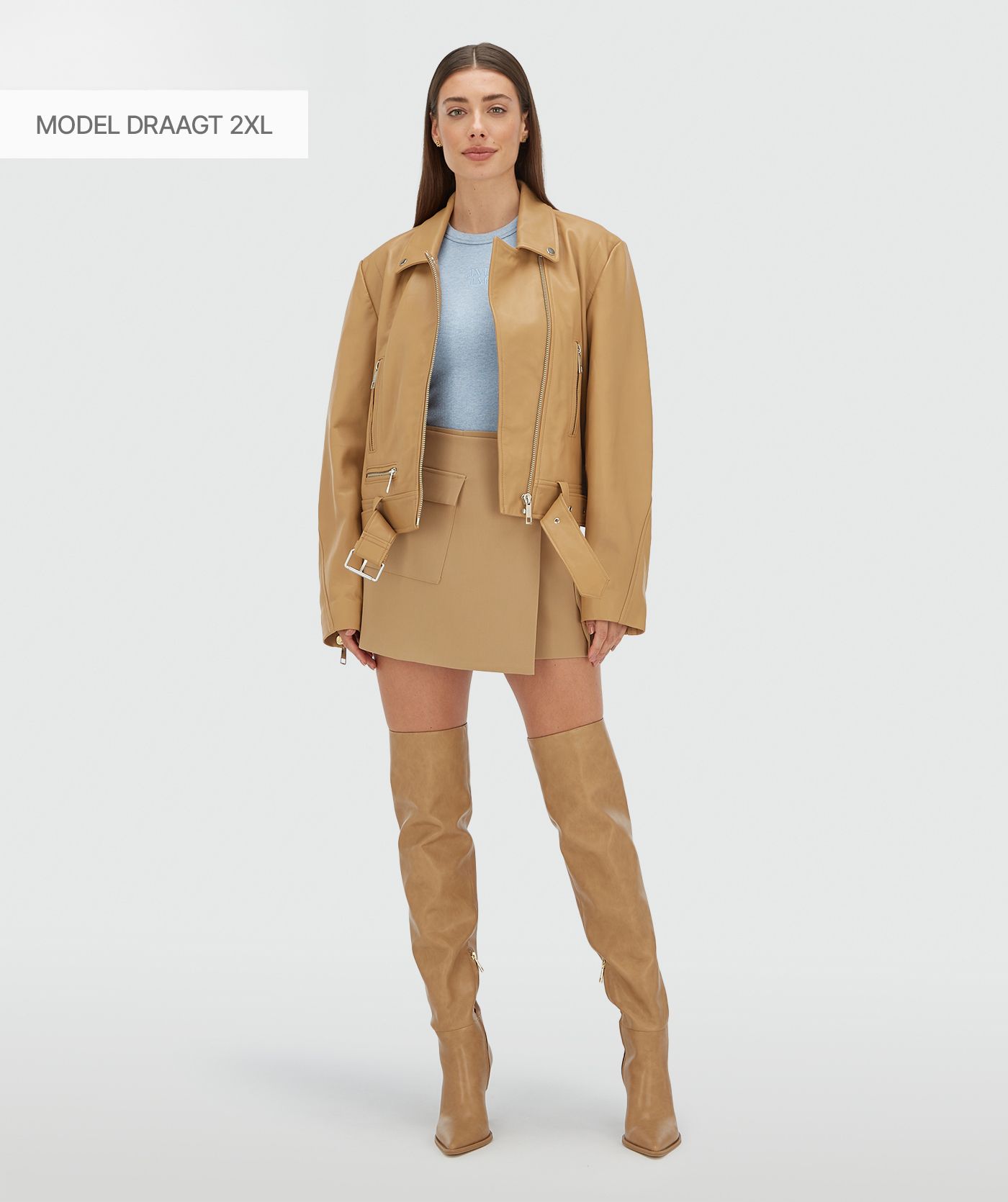 Ψάχνετε για ένα διαχρονικό δερμάτινο μπουφάν; Το γυναικείο μπουφάν JOSH V Lua σε χρώμα Light Brown είναι κατασκευασμένο από μαλακό, πιστοποιημένο δέρμα αρνιού και είναι ατελείωτα ευέλικτο. Διάφορες λεπτομέρειες – όπως η επένδυση με το σήμα JOSH V, τα φερμουάρ και το σχέδιο πλάτης σε σχήμα V – προσθέτουν αποκλειστικότητα στο μπουφάν. Αυτό το δερμάτινο μπουφάν κανονικής εφαρμογής περιλαμβάνει επίσης μια αποσπώμενη ζώνη με κλείσιμο με κούμπωμα στο πίσω μέρος, επιτρέποντας ποικιλία στυλ. Συμβουλή στυλ: Θέλετε ένα oversized δερμάτινο μπουφάν; Επιλέξτε δύο νούμερα μεγαλύτερα. Μήκος 54 cm σε μέγεθος M . Το μοντέλο έχει ύψος 175 cm και φοράει μέγεθος S .