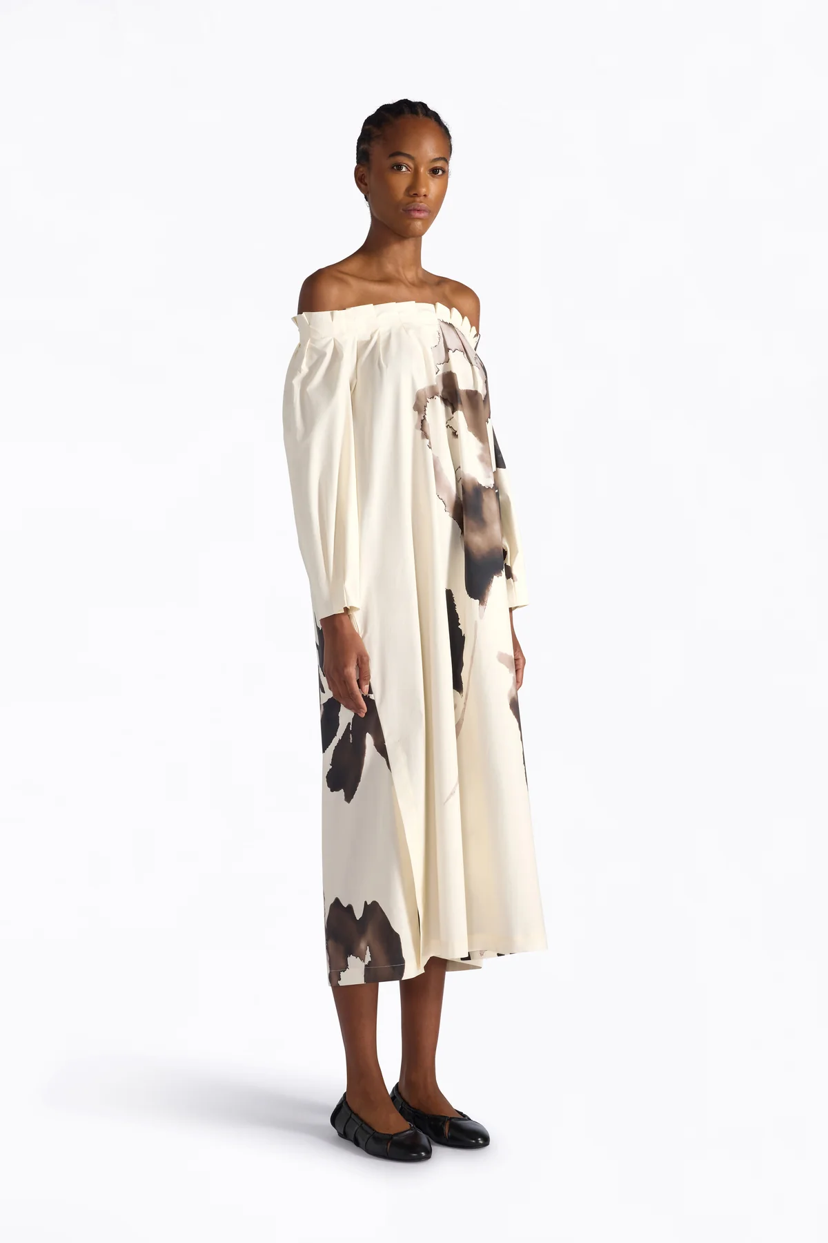 ΦΟΡΕΜΑ MIDI ΑΠΟ ΕΛΑΣΤΙΚΗ ΒΑΜΒΑΚΕΡΗ ΠΟΠΛΙΝΑ ΜΕ ΝΤΕΓΑΝΤΙΑΖΟΝΤΑ ΛΑΧΑΝΙΚΑ ΚΑΙ ΕΞΩΤΕΡΙΚΗ ΛΑΙΜΟΚΟΨΗ BARDOT. ΜΑΚΡΙΑ ΜΑΝΙΚΙΑ ΜΕ ΜΑΝΙΚΕΤΕΣ, ΠΛΙΣΕ ΛΕΠΤΟΜΕΡΕΙΑ ΣΤΗ ΛΑΙΜΟΚΟΨΗ, ΡΥΘΜΙΖΟΜΕΝΟΣ ΦΙΟΓΚΟΣ ΠΙΣΩ, ΚΡΥΦΕΣ ΠΛΑΪΝΕΣ ΤΣΕΠΕΣ.