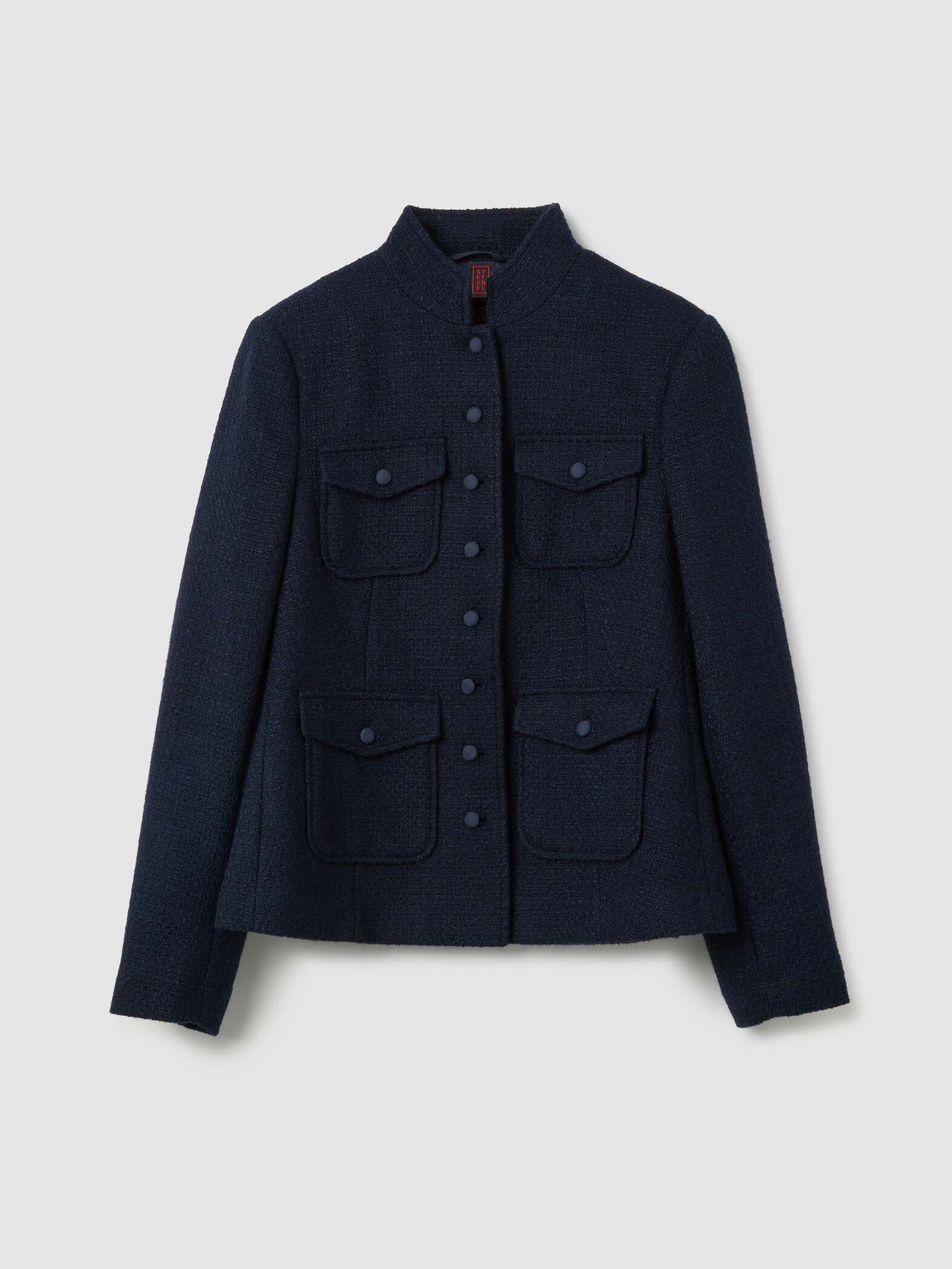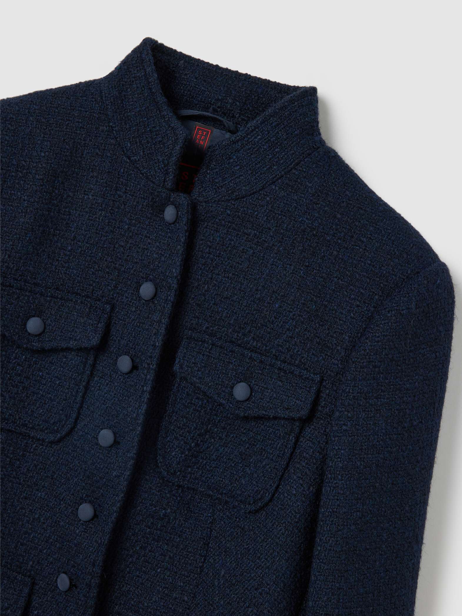 Το σχέδιο είναι εμπλουτισμένο με τσέπες στο στήθος και στα πλάγια, αναδεικνύοντας την πρακτικότητα και την εκλεπτυσμένη αισθητική.