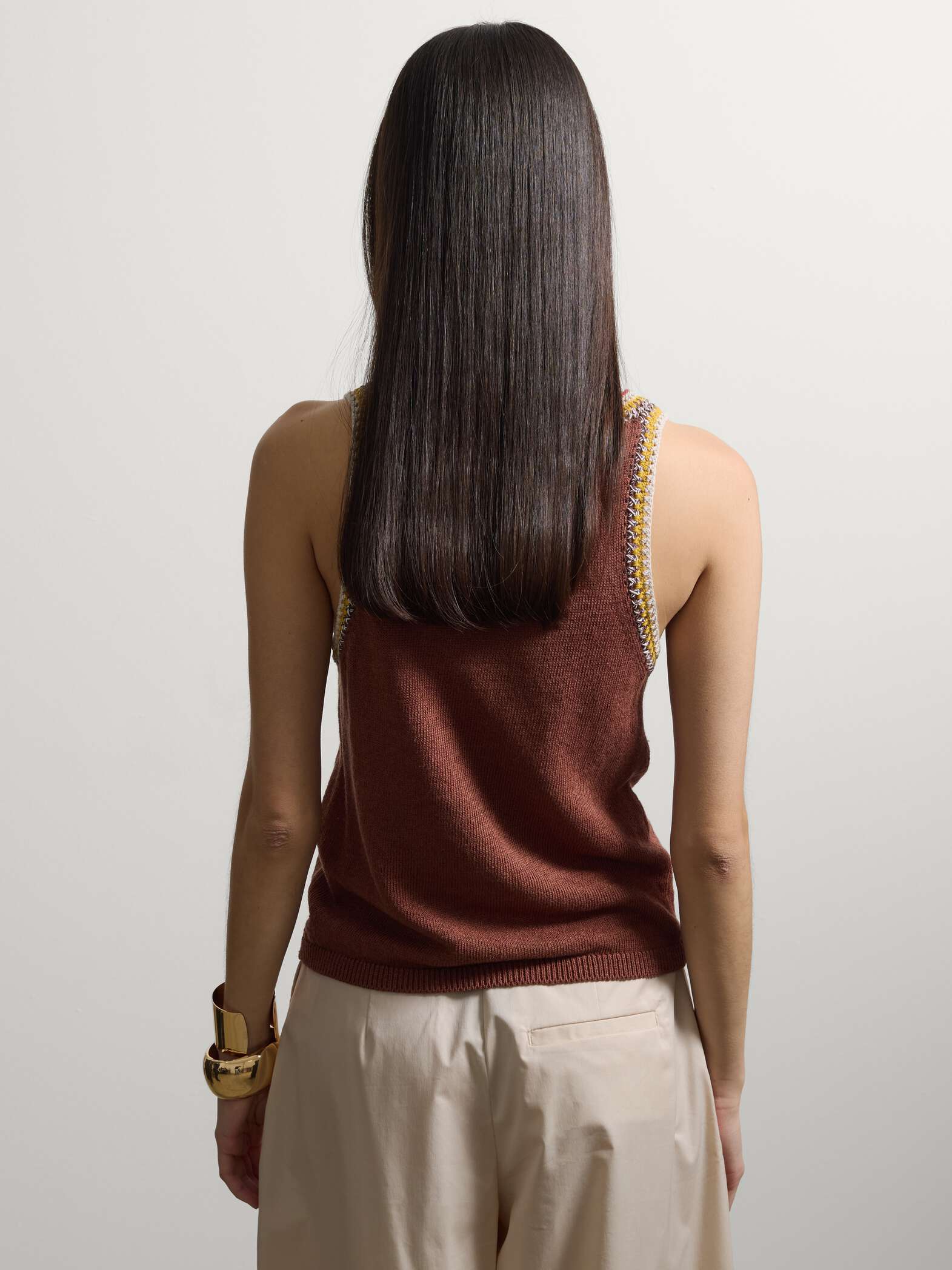 Αυτό το καφέ αμάνικο τοπ από λινό μείγμα ξεχωρίζει για την regular γραμμή του και την ελαφριά πλέξη.