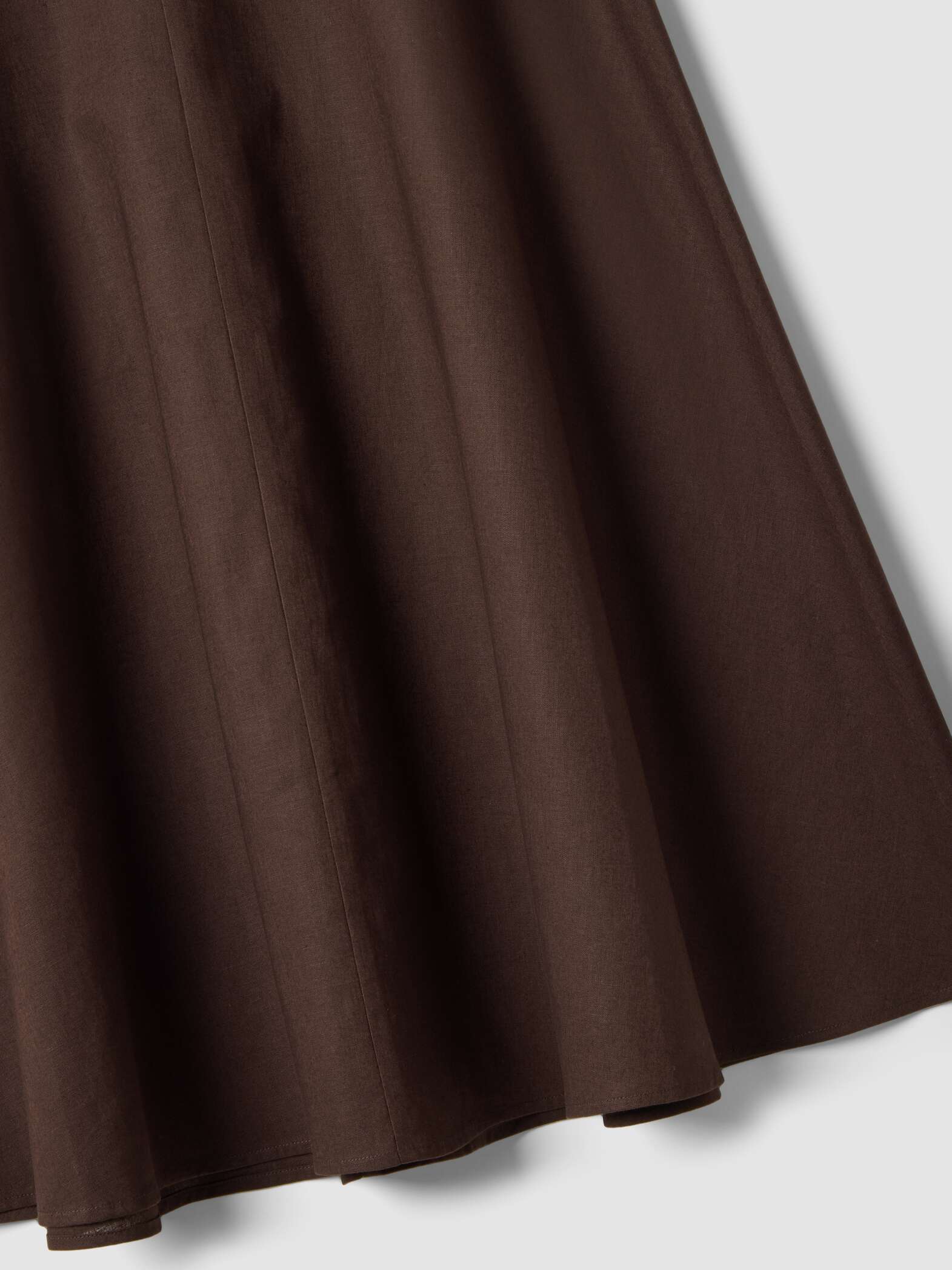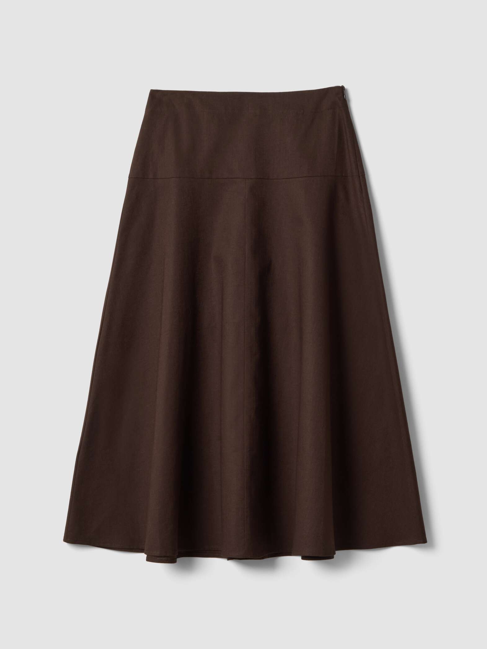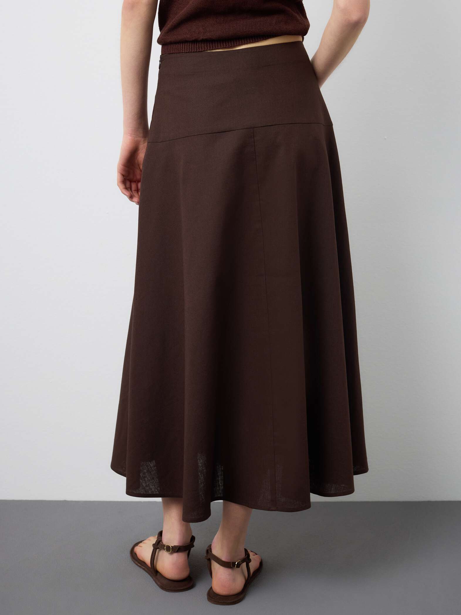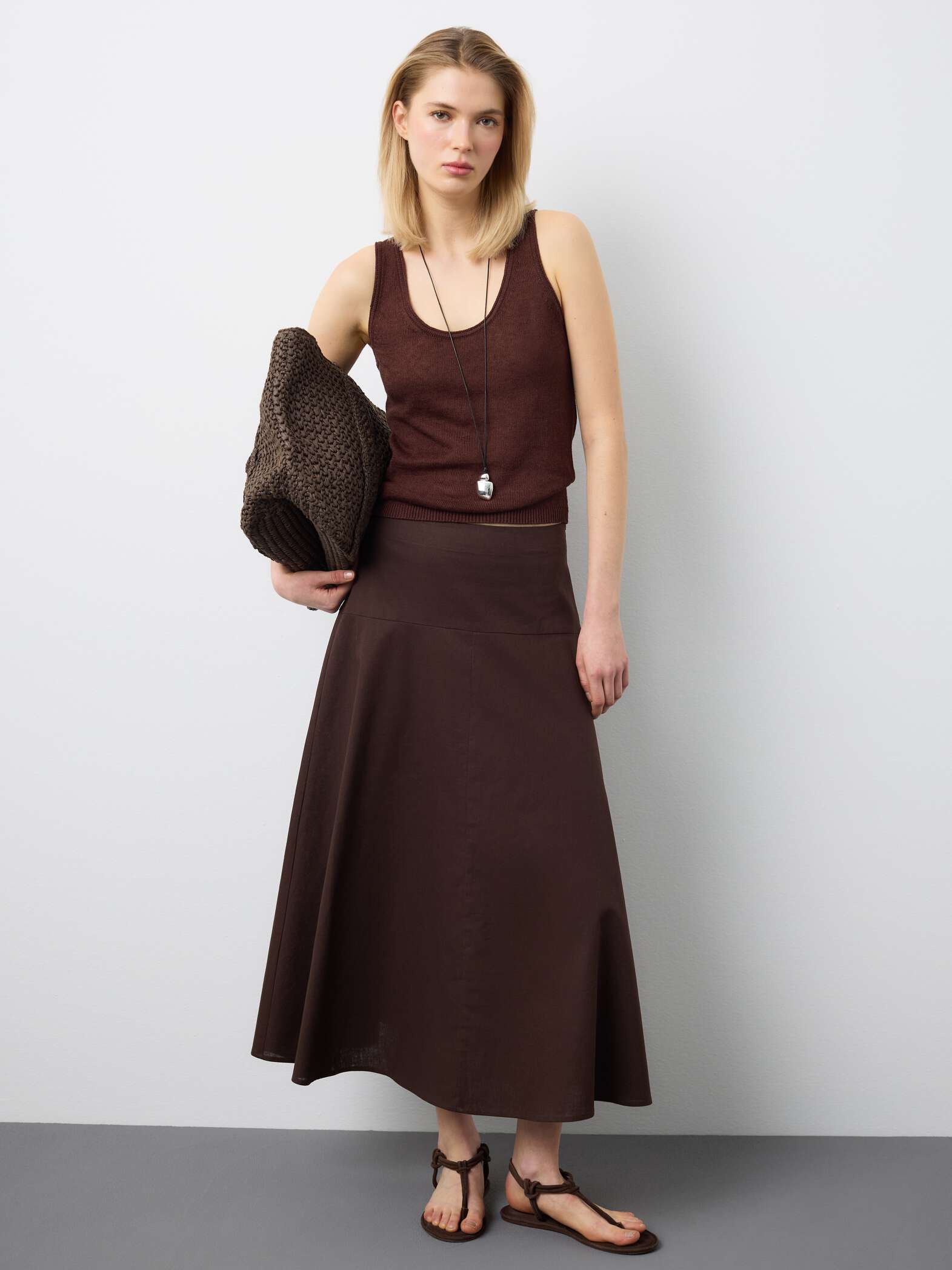 Αυτή η κομψή μακριά καφέ φούστα είναι κατασκευασμένη από μπλέντερ λινό-βαμβακερό.