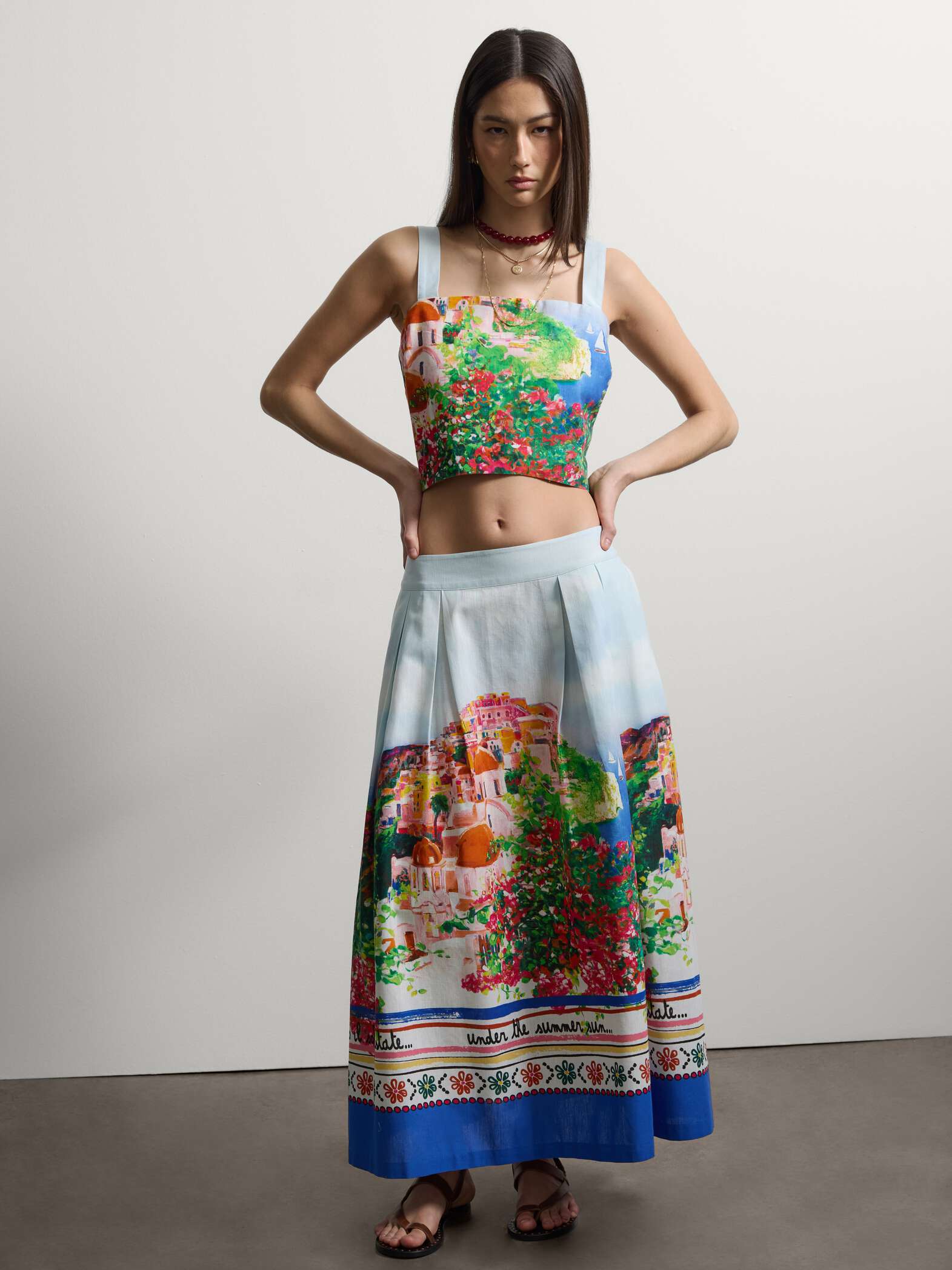Αυτή η πολύχρωμη φούστα από μείγμα βαμβακιού και λινού ξεχωρίζει με μια εντυπωσιακή, σκηνική στάμπα με μεσογειακή γοητεία.