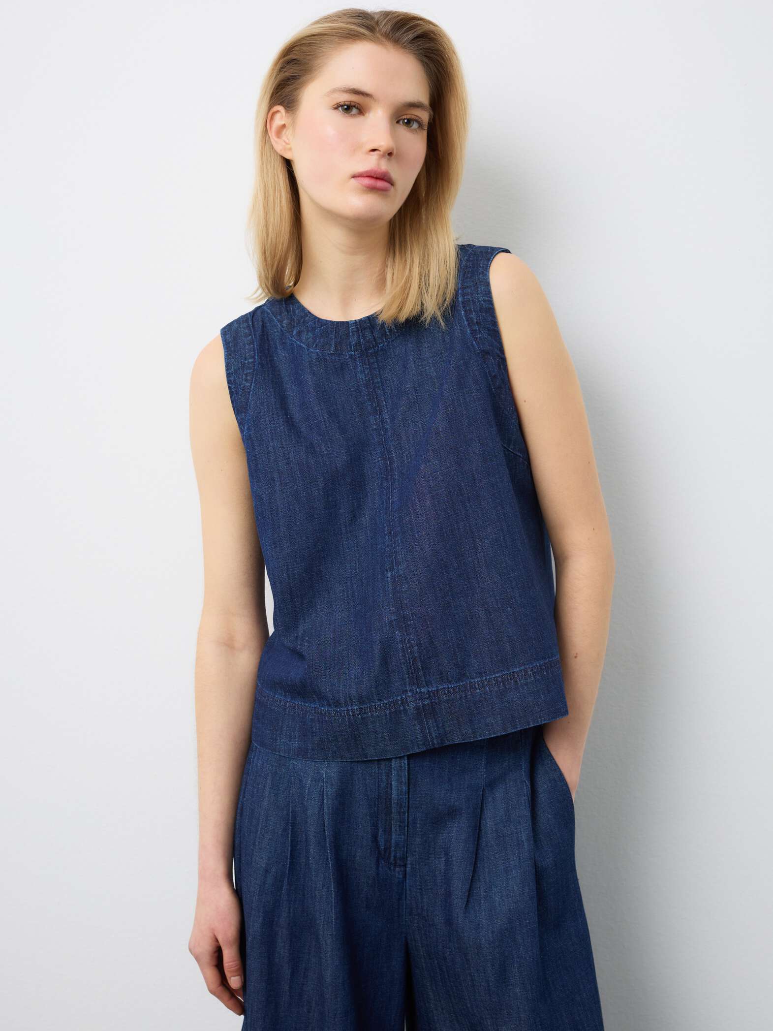Αυτό το αμάνικο μπλε τζιν πουκάμισο είναι φτιαγμένο από μείγμα βαμβακιού, λινού και βισκόζης.