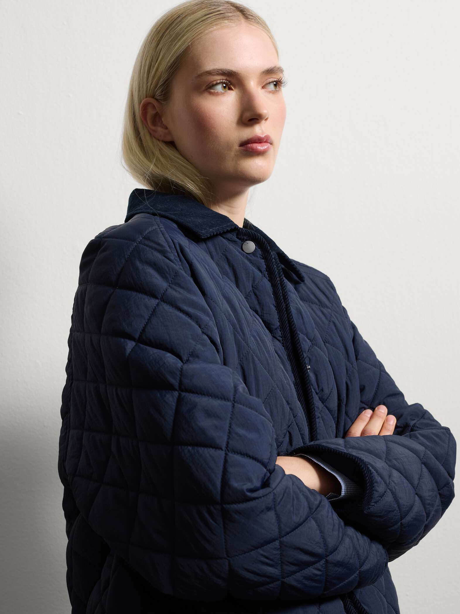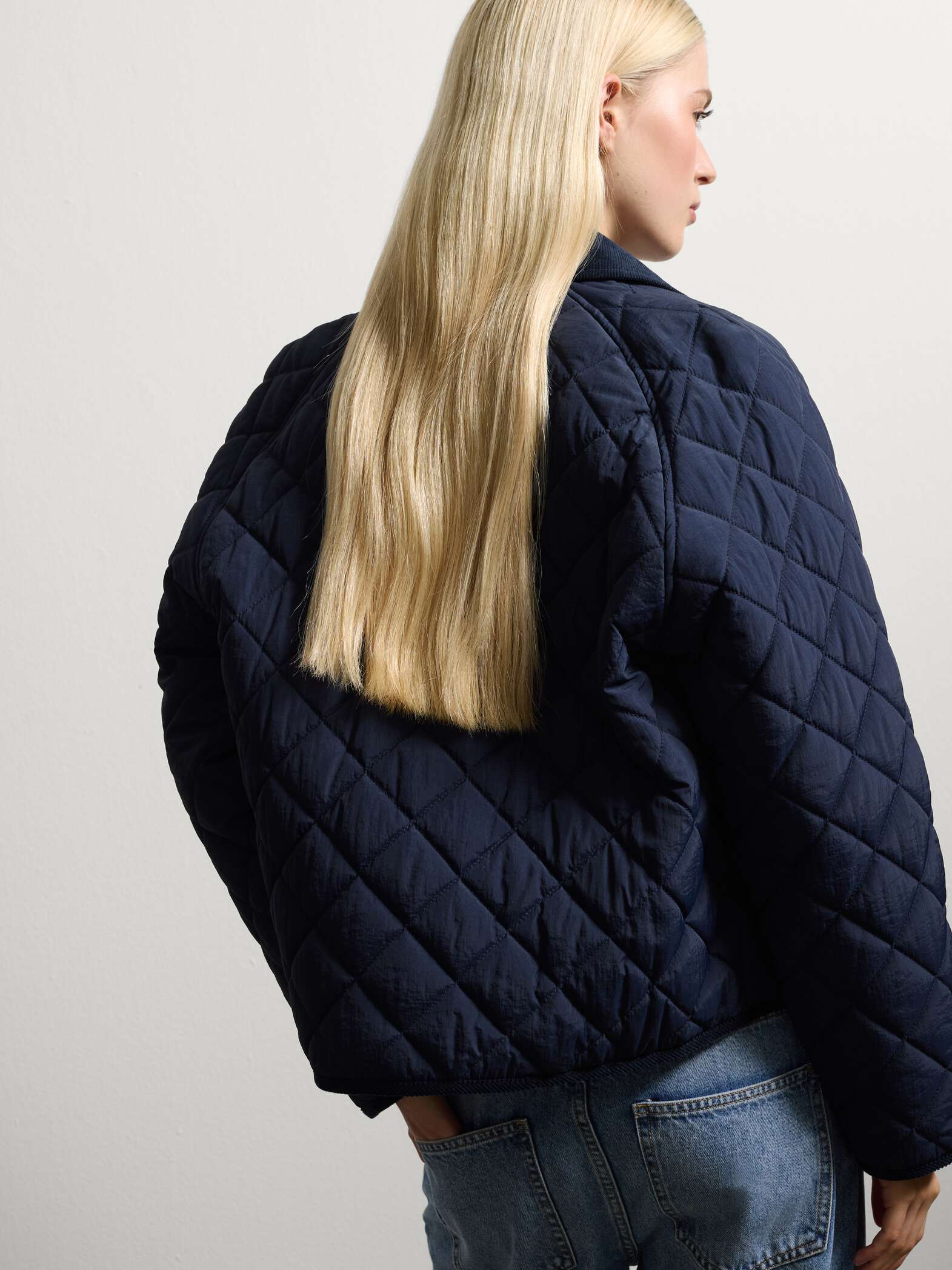 Το μπλε husky μπουφάν είναι ιδανικό για μεταβατικές εποχές, χάρη στο μοτίβο με διαμάντια που προσθέτει στυλ στην γκαρνταρόμπα σας και την κανονική εφαρμογή που εξασφαλίζει άνεση και ελευθερία κινήσεων. Ένα ευέλικτο κομμάτι, εύκολο να συνδυαστεί με διάφορα ρούχα για μια σταθερά μοντέρνα εμφάνιση. Το μοντέλο έχει ύψος 180 εκατοστά και φοράει μέγεθος XS.