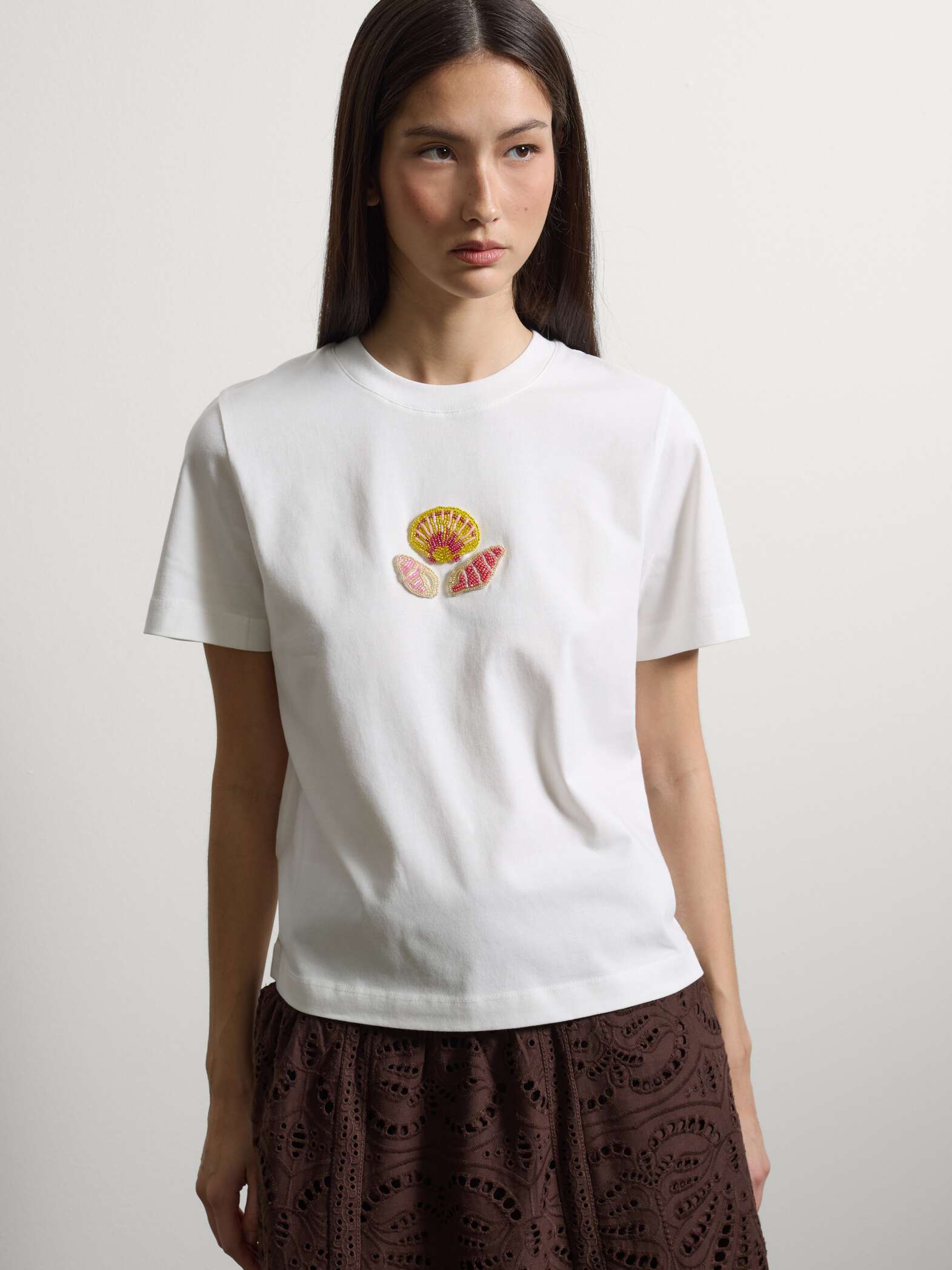 STEFANEL Regular-fit pure cotton T-shirt with beaded shells White