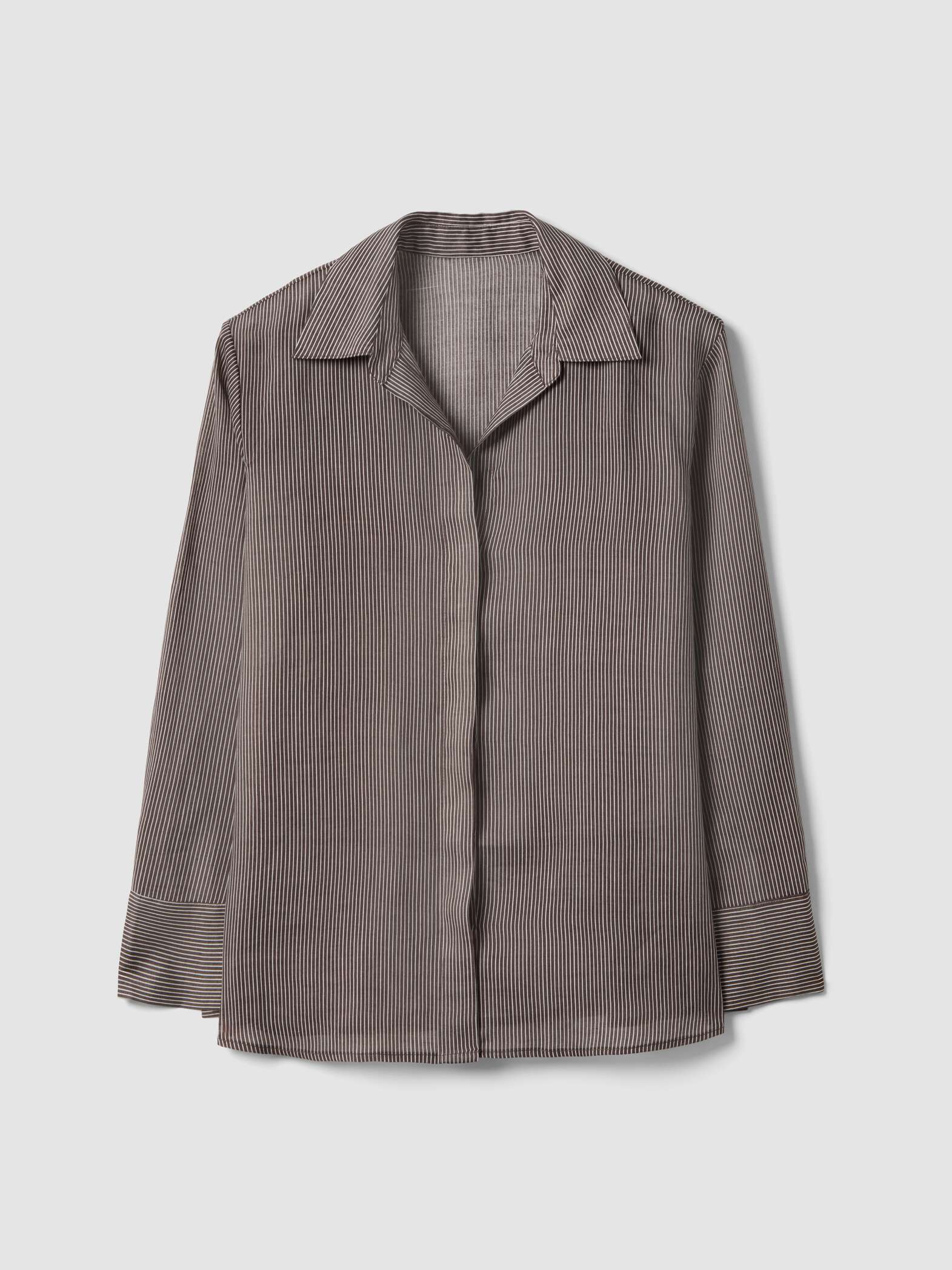 Αυτό το καφέ ριγέ πουκάμισο είναι φτιαγμένο από καθαρό ραμί, ένα ελαφρύ και αναπνεύσιμο υλικό, ιδανικό για την άνοιξη και το καλοκαίρι.