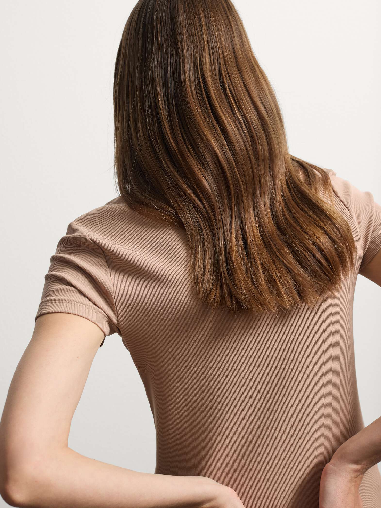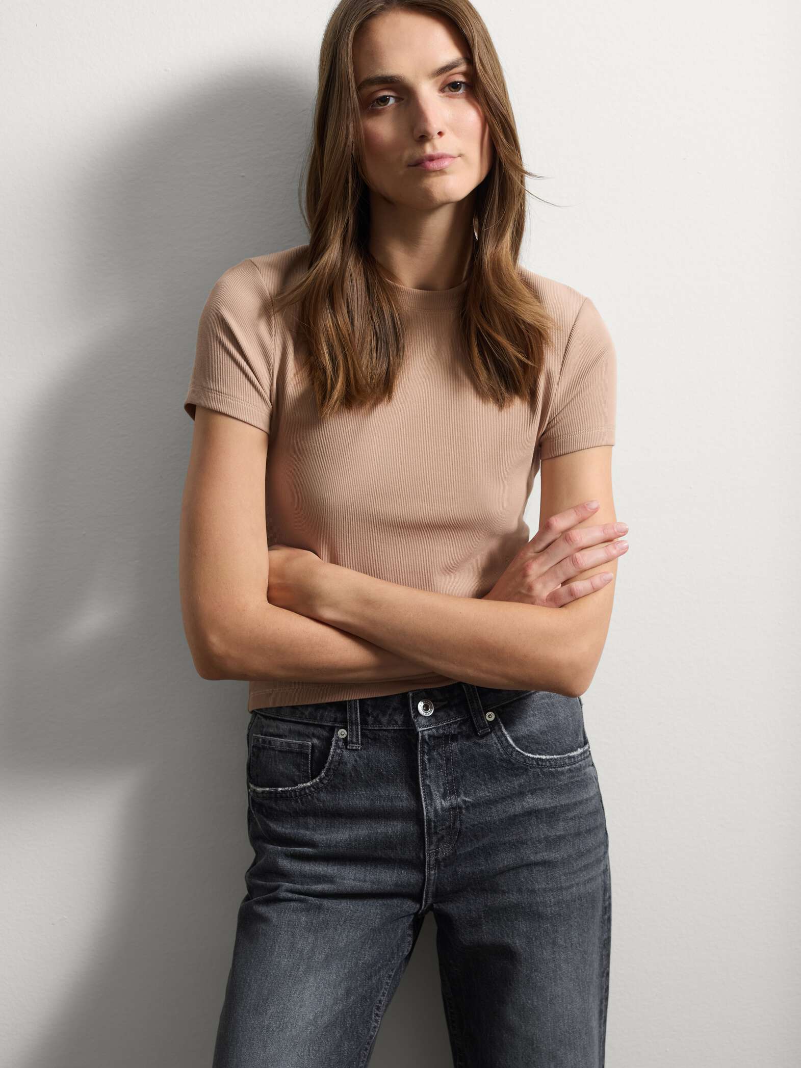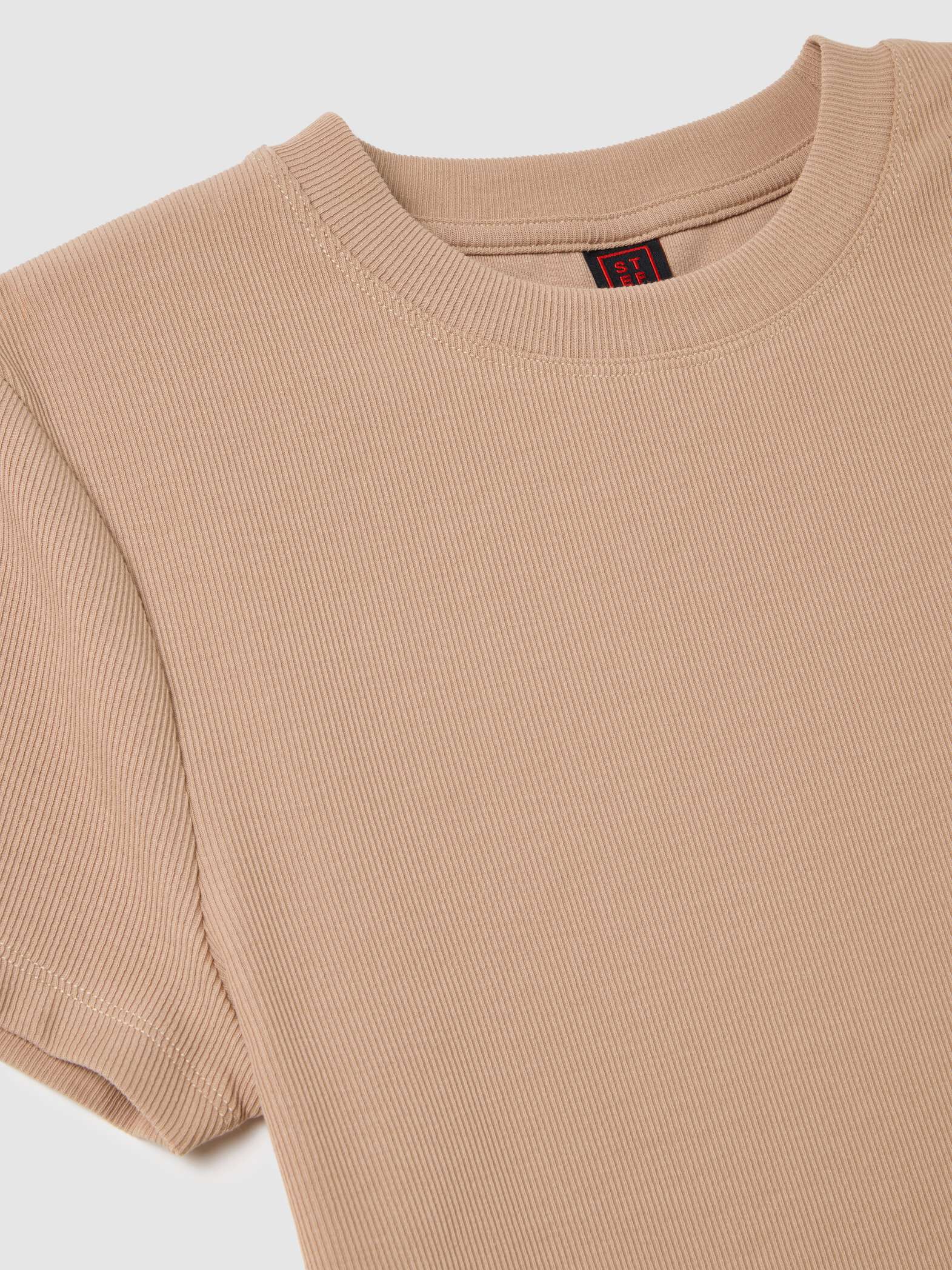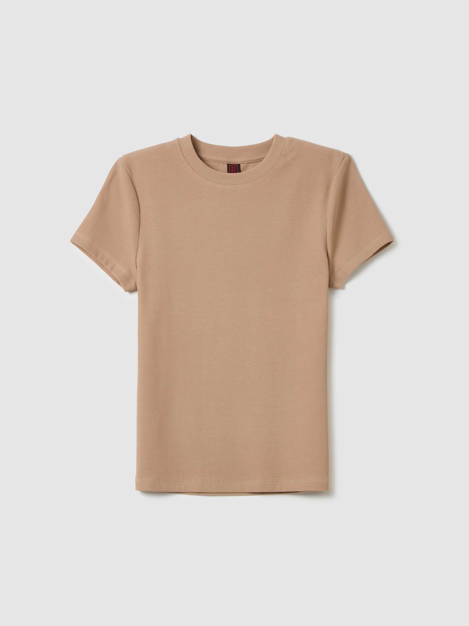 Αυτό το μπεζ μπλουζάκι είναι ένα ευέλικτο και άνετο ένδυμα φτιαγμένο από ελαστικό βαμβάκι.