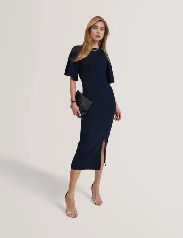 TED BAKER Short Sleeve Knitted Bodycon Midi Dress Navy